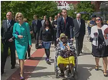 On 2 June 2013, Australian Governor-General Quentin Bryce handed over custodianship of Dayiwul Lirlmim at a ceremony at the Musée du quai Branly. On the impending unveiling of the rooftop installation, Bryce said "I look forward to millions of visitors to this beautiful city glimpsing an epically scaled and awe-inspiring wonder from the Kimberley on the bank of the Seine."[17] The installation was inaugurated on 6 June 2013, and saw Nyadbi and other dignitaries take a trip up the Eiffel Tower to view the work. Upon seeing her work on the rooftop Nyadbi shed tears, explaining that apart from feeling a great sense of excitement and pride it made her feel sorry for her traditional lands and whilst the diamond mine had destroyed the landscape of her country, the dreaming was still alive.[18] Lee-Ann Buckskin, the chair of the Aboriginal and Torres Strait Islander Arts Board, shared the tears with Nyadbi and said that the Dayiwul Lirlmim installation would bring to the attention to the people who see it of what is one of the world's oldest cultures.[19]