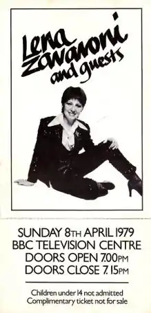 Ticket for the recording of Lena Zavaroni and Music at the time of recording the show was called Lena Zavaroni and Guests (1979).