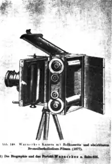 Warnerke is credited in 1875 with discovering the tanning effect of pyrogallic acid when used in the development of collodion, and an improvement of "dry" collodion emulsion, which he poured on a paper substrate in the form of a film layer.[4] He covered the smooth tissue paper successively with several layers of pure collodion and a solution of gum arabic, which through the formed a base for a photosensitive collodion or gelatin emulsion thick enough to be easily separated from the paper and permanently transferred to a moistened glass plate. The negative thus obtained could be used to make a positive, just like a glass negative.[5] This photosensitive material was produced by Warnerke's own company in sheets and rolls, from which rolls were cut into 100 photos for a single loading. Though, Warnerke achieved satisfactory results, the high production costs mitigated against greater than moderate commercial success.[6]