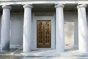 Leona Helmsley died of congestive heart failure at the age of 87, on August 20, 2007, at Dunnellen Hall, her summer home in Greenwich, Connecticut.[8] Cardiovascular disease ran in her family, claiming the lives of her father, son and a sister.[39] After a week at the Frank E. Campbell Funeral Chapel, she was entombed next to Harry Helmsley in a mausoleum constructed for $1.4 million[40] and set on ¾-acres in Sleepy Hollow Cemetery, Westchester County, New York. Among the few distinctive features of the mausoleum are three wall-embedded stained-glass windows, in the style of Louis Comfort Tiffany, showing the skyline of Manhattan. Leona Helmsley was known for not liking dirt, and left $3 million for the 1,300-square-foot family mausoleum to be "washed or steam-cleaned at least once a year".[41]