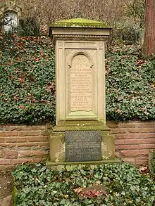 At the age of 60 Gmelin suffered a first stroke, and another in August 1850. In both strokes the right half of his body was affected; he was able to recover from the paralysis, but remained debilitated. In the spring of 1851 Gmelin applied for retirement, which was granted a few months later. In the two following years he suffered increasingly from the effects of a brain illness, at nearly 65 years Leopold Gmelin died in Heidelberg on 13 April 1853, and was buried at the Mountain Cemetery in Heidelberg. The grave complex is located in the department E. There also rests his wife Luise Gmelin and more family members.