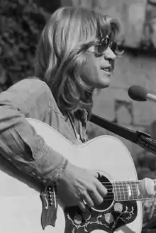 André Béchir, 1992 chief of "Good News", organized at the Hallenstadion Zürich an international "Oldies Night", where the Sauterelles with Düde, Freddy Mangili and Marc Portmann as a substitute for Bruno, performed successfully for a single re-union.[4] In 1993 Polo Hofer organized an open-air concert in Interlaken,[5] but Marc Portmann went with Andreas Vollenweider on a world tour, and Peter Glanzmann occurred as a guitarist for the band idiom. The Sauterelles now rehearsed again more or less regularly, although followed up to 1996 only a few gigs. Despite an announced Rock Night with Florian Ast, Amber and Les Sauterelles, the first concert had only just 100 visitors, but the next day, 15,000 spectators beyond the Castello Grande Bellinzona. In 1997 a "Sauterelles-Medley" including their hits was recorded, the band opened the exhibition "Walk on the Wild Side" (30 years of youth culture) in Lenzburg, and played at various festivals and their former favorite club, in the Café Atlantis in Basel. A year later, Les Sauterelles seem risen again as the opening act for Bob Dylan and Joe Cocker in the "Out In The Green" open-air festival Frauenfeld, and more gigs and concert halls performances. The US singer Eric St. Michaels covered "Heavenly Club", and for the Swiss television Toni and Eric song in the Prix Walo as a duet, followed by other appearances.[4]