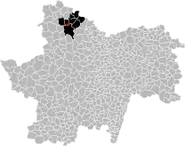 Map of the Saône-et-Loire communes, showing the extent of the Autun oil shale deposit in black and the Télots mine in red.
