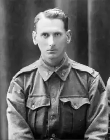 Chandler signed up with the Australian Imperial Force on 8 July 1915,[21] taking his camera with him to the Western Front, despite photography there being banned. Bayonet training at Seymour Army Camp persuaded him that "he couldn't kill anybody, just couldn't face that," as his daughter Mary remembered.[22] He volunteered instead as a stretcher-bearer in the 15th Field Ambulance, in which he served on the Western Front, in Egypt, and Belgium.[5] Despite photography being an activity forbidden to Australian soldiers, Chandler recorded lighter moments, the French people and what was left of the natural landscape and used a bulb release to include himself in the picture.