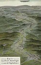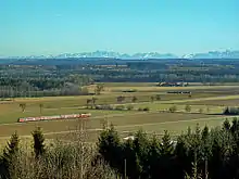 At the start of the line at Leutkirch station it turns northwest to the now disused Unterzeil station and then swings back sharply to the northeast towards Memmingen, passing through the stations of Altmannshofen and Aichstetten. This curve came about due to the interest of the Earl of Waldburg-Zeil in having a rail link to Unterzeil, which lies below Zeil Castle.[6] Aichstetten Shell siding is served daily by tankers hauled by private locomotives.
