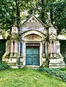 Schofield family mausoleum at Lake View Cemetery. Levi T. Scofield designed the structure and was interred there following his death in 1917.