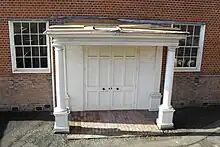 Although externally clad in red brick and tiles, the chapel is completely timber-framed.[3][8] The entrance is at the east end and is framed by a porch with columns of the Tuscan order, described by Nikolaus Pevsner as "over-broad".[13] Above this, three evenly spaced sash windows, an oculus and the stone tablet sit below the gable. A chimney breast extends up the west wall. The roof is covered with slate tiles and has a small boxlike louvred projection, topped with a pyramid-style cap, in the middle. There are four pairs of sash windows in the north and south walls, which are faced with mathematical tiles and slates respectively.[8]