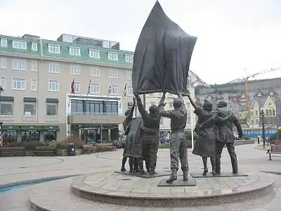 Liberation sculpture in front of Pomme d'Or Hotel, Jersey