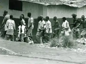 By May 1990 the AFL had been forced back to Gbarnga, still under the control of Bowen's troops, but they lost the town to a NPFL assault on 28 May.[11] By June 1990, Taylor's forces were laying siege to Monrovia. In July 1990, Prince Yormie Johnson split from Taylor and formed the Independent National Patriotic Front (INPFL). The INPFL and NPFL continued their siege on Monrovia, which the AFL defended. In their Freedom in the World report for 1990, Freedom House described Monrovia by July as "a virtual ghost town of starving people and rotting corpses" as the rebel advance on the city caused widespread panic and anarchy, leading to Liberian soldiers looting shops and killing civilians at random, all while hunger and disease quickly took hold.[12] Johnson swiftly took control of parts of Monrovia prompting evacuation of foreign nationals and diplomats by the US Navy in August.
