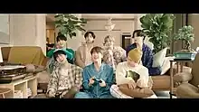 The full four-minute-long music video premiered on YouTube on November 19, 2020.[24] More personal and "sentimental" in nature, it presents the band living together in isolation in their dorm during the COVID-19 pandemic—in one scene RM "wistfully wipes a couple of fingers' worth of dust off his bicycle seat" as he can no longer participate in that outdoor activity[19]—having a pajama party, watching movies, and playing video games,[25] intercut with a clip of V driving his band mates around South Korea and eventually past Seoul Olympic Stadium—he "peers out the window" and "longingly stares" at the venue as they pass it—where the band was slated to kickoff their Map of the Soul Tour several months prior, before it was ultimately cancelled due to the pandemic. The latter part of the video features a black and white sequence of the band envisioning themselves singing the song in the empty stadium "with stage lights shining down on them" as the video fades out. At a press conference held the day of Be's release, Jungkook said that his intent with the music video was to express the "sadness and the longing" the band felt due to the tour's cancellation "and because we couldn't see ARMY much".[26]