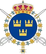 The coat of the arms of the Life Guard Dragoons (K 1/Fo 44) 1977–1984, the Life Guard Dragoon at I 1/Fo 44 1984–1994 and the Life Guard Dragoons (K 1) 1994–2000. Blazon: "Azure, the lesser coat of arms of Sweden, three open crowns or, placed two and one. The shield surmounted two rapiers in saltire argent and surrounded by the chain of the Royal Order of the Seraphim or underneath the rapiers and the crown."[15]