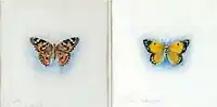 Her initial London showing in 1898 at the Royal Society of British Artists was atypical of her subsequent work being a watercolour study of a Small tortoiseshell and Cornflowers. She completed a series of detailed studies of butterflies at this time including Butterfly On Blackberry Bush shown at the Bedford Society of Artists which the Bedfordshire Times described thus ... of such minute fidelity as to bear scrutiny with a magnifier. This lady's exact drawing and colouring should be of great value to publishers and men of Science, but there is also poetry in the motion and the composition ....[13] This was a perspicacious review as Stannard's colourful reproductions began to appear on postcards and to be included in popular gardening books such as those by Walter and Horace Wright.[4] Lucrative commissions from owners of some of the finest gardens in England also materialised.[1] In June 1906 a solo exhibition of fifty-two watercolours at the Mendoza Gallery entitled Summer Gardens of England[14] was patronised by the Princess of Wales who bought, The Lover's Walk, Wavendon House.[2] Many of England's grandest gardens and houses were represented: Woburn Abbey, Penshurst Place, Hampton Court, Levens Hall are all featured. The Observer newspaper review was fulsome in its praise ...I defy any lover of an old-fashioned English garden to see these drawings without real delight. There is a peace, a repose, almost a fragrance about each and all of them ...[15] The Times critic was less effusive but described Stannard as ... a serious rival of other artists who have devoted themselves to gardens ...[16] A major commission came from Lady Anastasia Wernher (1892-1977), for whom she painted a series of views of the gardens at Luton Hoo in Bedfordshire.[12] A further exhibition of thirty watercolours entitled Flower Gardens of England at the Mendoza Gallery in 1907 was similarly well received.[17]