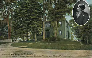 In 1874, Stevens was in her early 30s and raising a seven-year-old daughter.[22] As a resident of Cumberland County, her region had founded a local temperance society over forty years earlier.[23] Francis Murphy announced a temperance camp meeting for September, 1874 at Old Orchard Beach, near Portland, Maine.[24] Lillian Stevens learned that Frances Willard was scheduled to speak at the camp meeting,[25] and eagerly joined the group, bringing her young daughter with her.[6] Lillian Stevens met Frances Willard at this meeting. In her daughter's words, "These two women were drawn to one another and thus began a friendship enduring through the years."[6] The National WCTU was organized at Cleveland, Ohio in 1874.[26] In 1875, Maine followed with the Woman's Christian Temperance Union of Maine, formed at Old Orchard Beach.[27]