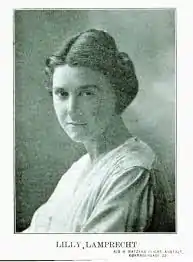 Lilly Lamprecht née Camradt (1887–1976) was a Danish operatic soprano. She made her début at the Royal Danish Theatre in 1911 in the title role of Liden Kirsten. Her roles included Madame Butterfly, Cherubino in The Marriage of Figaro and Micaëla in Carmen. She left the company in 1931 but returned in 1933 to perform Marguerite in Faust. Lamprecht was honoured as a Royal Chamber Singer in 1922.[1][2][3]
