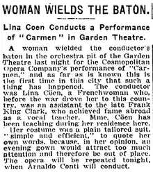 1. "WOMAN WIELDS THE BATON.; Lina Coen Conducts a Performance of "Carmen" in Garden Theatre". The New York Times. 1917-02-08. p. 10. Retrieved 2020-07-14.