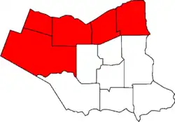 The municipalities which previously formed Lincoln County are highlighted in red. They are now part of the Regional Municipality of Niagara.