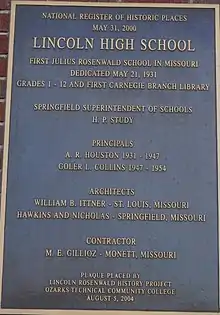 - ↑ Katherine Lederer, Scott P. Myers, and Steven E. Mitchell (April 2000). "National Register of Historic Places Inventory Nomination Form: Lincoln School" (PDF). Missouri Department of Natural Resources. Retrieved 2017-01-01.