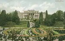 To the west of the house, Loudon laid out a flower garden. Later in the 1860s this was replanted with roses, but it is now lawns. At the south end of a walkway through this section of the garden is a water and rock garden known as "Jacobs Well". From the north end of the walk an avenue of giant sequoias planted in 1864 runs north-west towards the parish church of St Nicholas. Other Giant Sequoia are planted around the gardens. Close to the church, at the end of a paved walk is a small Gothic folly designed by Richard Bentley.[1][14] South of the avenue is a grass amphitheatre cut into the slope. The southern perimeter of the formal garden is formed by a ha-ha.[1] To the south, beyond the formal gardens, the steepness of the slope reduces and the estate continues as open parkland with a tree-fringed lake about 500 metres (1,600 ft) south of the house.[1]