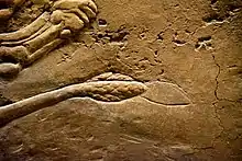 Some of the lion hunt reliefs occupy the whole height of the slab; like most narrative Assyrian reliefs the scenes of military campaigns from the same palace are mostly divided into two horizontal registers.[4] The reliefs which came from the upper floor have scenes on three registers.[1] Ground-lines are clearly indicated, which is not always the case, and indeed some lions are given individual ground lines when forming part of a larger scene. As well as the animals, depicted with "extraordinary subtlety of observation",[9] the carving of the details of the king's costume are especially fine.[4] At a late stage in their execution, the tails of nearly all the lions in the single register reliefs were shortened.[17]