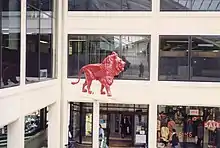 For many years a central feature of the atrium was a white pillar with the statue of a large red lion on the top of it, safely out of easy reach. This recalled the Red Lion pub which had occupied the site until demolished in 1969.[3] The lion statue was removed in 1999 and is now at the Cambridge University rugby club's ground on Grange Road.[4] A red lion is an emblem of the University of Cambridge and the crest of its rugby club.