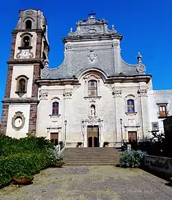 On the left side from the viewer's point of view is the massive square four-levelled bell tower, built between 1755 and c.1800. The uppermost level is cylindrical and joined to the level below with massive curled volutes. Convex pilasters and cornices in volcanic stone frame the first three levels. The first level is marked by a blind oval window, the second by a single arched window, the third by another single arched window above a system of volutes containing a clock on the NW face (on the other faces the clock space is instead an empty window. The uppermost, cylindrical level has single arched openings and inscribed plates.