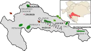 During the war, the Austro-Hungarian Army saw mass desertions of conscripts from rural areas who escaped from barracks, hospitals or never reported back after a leave. Most lived at home and only fled to nearby forests to evade gendarmes when warned by local population.[6] In 1917, the deserters were first referred to as the Green Cadres by the authorities in the Croatia-Slavonia.[7] By September 1918, there were about 50,000 Green Cadres among the Croats, Serbs, and Bosniaks (about 10,000 in Bosnia, and the bulk in Croatia-Slavonia).[8] Petrova Gora, Fruška Gora, Zrinska Gora, and Papuk mountains, as well as Hrvatsko Zagorje, and the surroundings of the village of Dalj saw large numbers of the Green Cadres.[9]