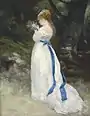 Tréhot began modeling for Renoir when she was about eighteen and he was twenty-five. Early paintings of Tréhot at this time include Lise in a Straw Hat (1866) and Lise Sewing (1867–68). Renoir is thought to have painted a modern nude of Tréhot as Diana (1867), but it was rejected by the Salon of 1867.[note 1] Renoir found critical success the next year with Lise (1867), which was well received at the Salon of 1868. The Impressionist painting depicts Tréhot in a life-size portrait, strolling through a wooded park as sunlight falls through the trees.[6] Art critic Zacharie Astruc described Tréhot in Lise as "the likeable Parisian girl in the woods", and as a working-class girl.[6] Émile Zola also approved, comparing Tréhot to Monet's model and later wife Camille Doncieux.[1][9] French art critic Théodore Duret later observed that because Renoir's Lise was derivative of Gustave Courbet's technique, its appearance at the Salon "provoked no definite opposition".[10] However, Renoir's decision to shadow Tréhot's face in darkness and emphasize the reflection of sunlight from her white dress in Lise led several critics to ridicule Tréhot's appearance due to the unusual contrast.[5][11][12]
