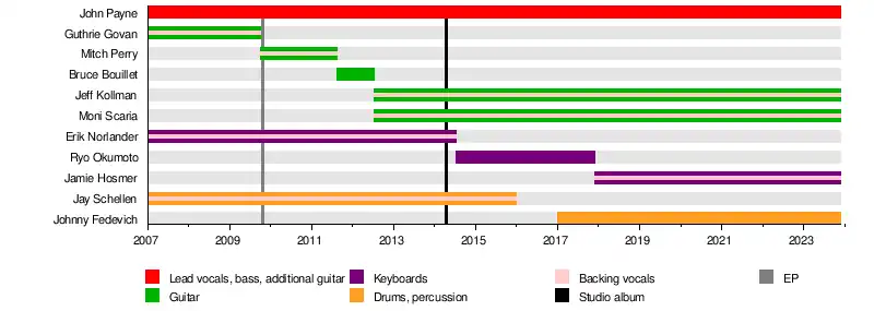 Another version of the band is led by John Payne, who was lead vocalist and bassist between 1991 and 2006. This formation was founded in 2007 following a reunion of the original members, with then current members Payne, Guthrie Govan (guitar) and Jay Schellen (drums) joining keyboardist Erik Norlander as Asia featuring John Payne, their current line-up includes guitarists Jeff Kollman and Moni Scaria (both since 2012), keyboardist Jamie Hosmer and drummer Johnny Fedevich (both since 2017).