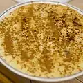 Rice pudding topped with raisins, cinnamon, and sugar, typically served during Christmas |