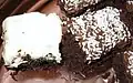 Thin chocolate cake topped with melted chocolate and shredded coconut |