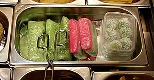 Seri muka Banjarese and Malay A two-layered dessert with steamed glutinous rice forming the bottom half and a green custard layer made with pandan juice.