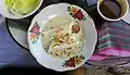 Malay and Minangkabau | A pretty dish that looks like a lace doily due to the way it is made. Usually served with kari daging kambing. |
