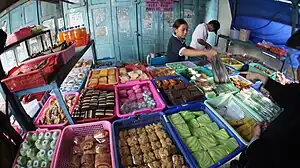 Variation of Indonesian kue basah snack foods offered as jajan pasar ("market buys") at a traditional market in Yogyakarta.