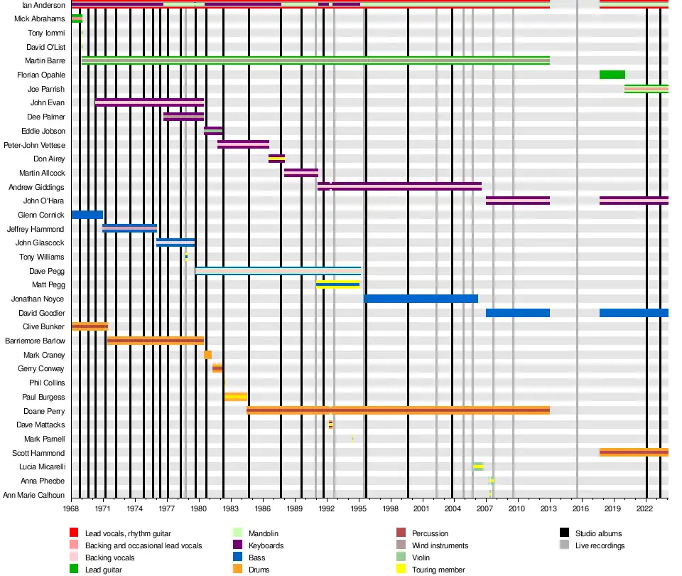 Craney and Jobson both left after the A tour in 1981, with their places taken by Gerry Conway and Peter-John Vettese, respectively.[14] Conway left after performing on 1982's The Broadsword and the Beast and the European leg of the album's tour,[15] with Paul Burgess brought in to complete US dates later in the year.[16] In 1984, Doane Perry joined as Conway's permanent replacement after the recording of Under Wraps.[17] The group was placed on temporary hiatus during the mid-1980s as Anderson dealt with throat problems, before returning in 1987 (without Vettese) on Crest of a Knave.[18] Maartin Allcock took over as the band's keyboardist in 1988, remaining until 1991 when Andrew Giddings took his place.[19] Pegg left in 1995 to focus on Fairport Convention, with Jonathan Noyce brought in later as his replacement.[20]