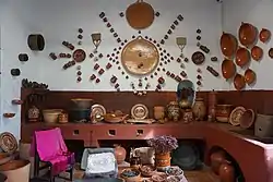 Representation of a Mexican kitchen; in front are Mexican food and spices, while in the background there are typical utensils.