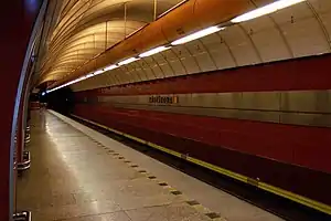 Nusle | Vyšehrad fortress, castle and cemetery | C | May 9, 1974 | formerly Gottwaldova, after Klement Gottwald Side platforms partially in a tunnel, partially on a viaduct, due to being built through a cliff face running perpendicular to the line. |