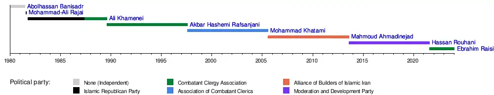 | 3 | Ali Khamenei علی خامنه ای (born 1939) ![]() | 9 October 1981 | 16 August 1989[2] | 7 years, 311 days | IRP CCA | 1981 (Oct) 1985 | Member of the Parliament of Iran (1980–1981) | Mir-Hossein Mousavi | Mousavi I–II | |