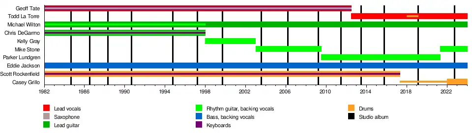 Queensrÿche is an American progressive metal band formed in 1982 from Bellevue, Washington. The bands original and most famous lineup consisted of guitarists Michael Wilton and Chris DeGarmo, drummer Scott Rockenfield, bassist Eddie Jackson, and lead vocalist Geoff Tate. The band currently consists of Wilton and Jackson alongside rhythm guitarist Mike Stone (from 2003 to 2009 and since 2021), lead vocalist Todd La Torre (who replaced Tate in 2012) and drummer Casey Grillo (who has been touring with the band since 2017 and recording since 2020).