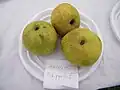 Annie Elizabeth[39][13][6][30][34][12][27] Leicester, Leicestershire, England 1857, introduced 1868 Large yellow apple, FCC from RHS in 1868. Width 79–87 mm (3.1–3.4 in), height 63–65 mm (2.5–2.6 in). Stalk 9–18 mm (0.35–0.71 in). Cells, obovate, abaxile.Flesh; creamy white, firm, coarse-textured, dry acid. Cooks well, breaks up completely. Cooking PickE late September–early October; use November–April