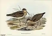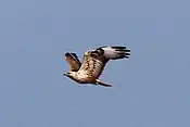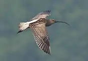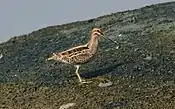 Bustards are large terrestrial birds mainly associated with dry open country and steppes in the Old World. They are omnivorous and nest on the ground. They walk steadily on strong legs and big toes, pecking for food as they go. They have long broad wings with "fingered" wingtips and striking patterns in flight. Many have interesting mating displays.
