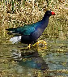 Rallidae is a large family of small to medium-sized birds which includes the rails, crakes, coots, and gallinules. Typically they inhabit dense vegetation in damp environments near lakes, swamps, or rivers. In general they are shy and secretive birds, making them difficult to observe. Most species have strong legs and long toes which are well adapted to soft uneven surfaces. They tend to have short, rounded wings and to be weak fliers.