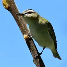 The vireos are a group of small to medium-sized passerine birds. They are typically greenish in color and resemble wood warblers apart from their heavier bills.