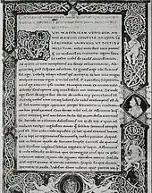 The Diocletianic Persecution started on March 31, 302, with the Roman Emperor Diocletian, in a rescript from Alexandria, ordering that the leading Manichaeans be burnt alive along with their scriptures.[26][27] On the following year, on February 23, 303, Diocletian ordered that the newly built Christian church at Nicomedia be razed, its scriptures burned, and its treasures seized.[28] Later persecutions included the burning of both the Christians themselves and of their books. As related in later Christian Hagiography, at that time the governor of Valencia offered the deacon who would become known as Saint Vincent of Saragossa to have his life spared in exchange for his consigning Scripture to the fire. Vincent refused and let himself be executed instead. In religious paintings he is often depicted holding the book whose preservation he preferred to his own life (see illustration in Saint Vincent of Saragossa page.)[29] Conversely, many other Christians, less courageous, did save their lives by giving away their Scriptures to be burned. These Christians came to be known as Traditores (literally, "those who give away").