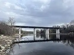 | Morris Island Train Bridge | Pedestrian pathway | 498 m | 1915 | 45°27′59.26″N 76°17′10.57″W / 45.4664611°N 76.2862694°W | Originally carried Canadian Northern Railway (1915—1998) and the Ottawa Central Railway (1998—2008). Converted into a pedestrian bridge in 2014. Fitted to accommodate snowmobiles in 2022.[1] | |