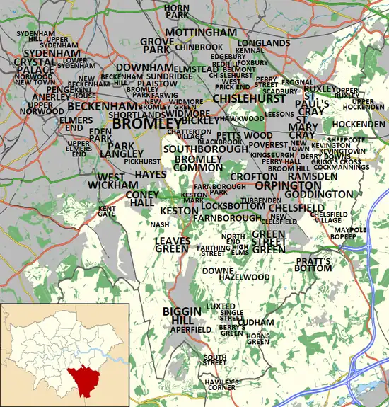 | Leaves Green | Bromley Common and Keston, Hayes and Coney Hall | Beckenham | KESTON, ORPINGTON | BR2, BR6 | 01689 | TQ418627 | Village | ![]() |
