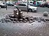 Not functional due to the canalization being damaged by cars. Sculpture dimenstions: 70 x 140 x 180 centimeters. The fountain is made of travertine inlaid with granite. | |