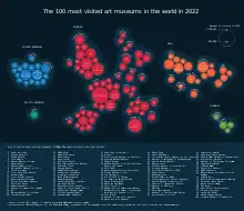 Total attendance in the top one hundred art museums in 2022 was 141 million visitors, double the number in 2021 and three times the number for 2020, but still well below the 2019 figure of 230 million visitors.[1]