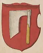 Topór is one of the oldest Polish coats of arms. The oldest known image is the seal of Żegota, the Kraków voivode.[30] Historically, this coat of arms was used by 639 Polish noble families.[31] | |