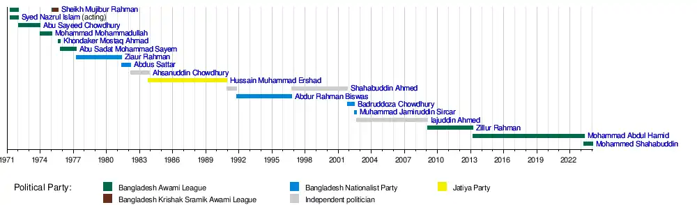 Mohammed ShahabuddinMohammad Abdul HamidZillur RahmanIajuddin AhmedMuhammad Jamiruddin SircarBadruddoza ChowdhuryAbdur Rahman BiswasShahabuddin AhmedHussain Muhammad ErshadA. F. M. Ahsanuddin ChowdhuryAbdus Sattar (president)Ziaur RahmanAbu Sadat Mohammad SayemKhondaker Mostaq AhmadMohammad MohammadullahAbu Sayeed ChowdhurySyed Nazrul IslamSheikh Mujibur Rahman