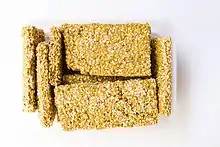 - Sesame-seed candy – a confection of sesame seeds and sugar or honey pressed into a bar or ball, it is popular from the Middle East through South Asia to East Asia.